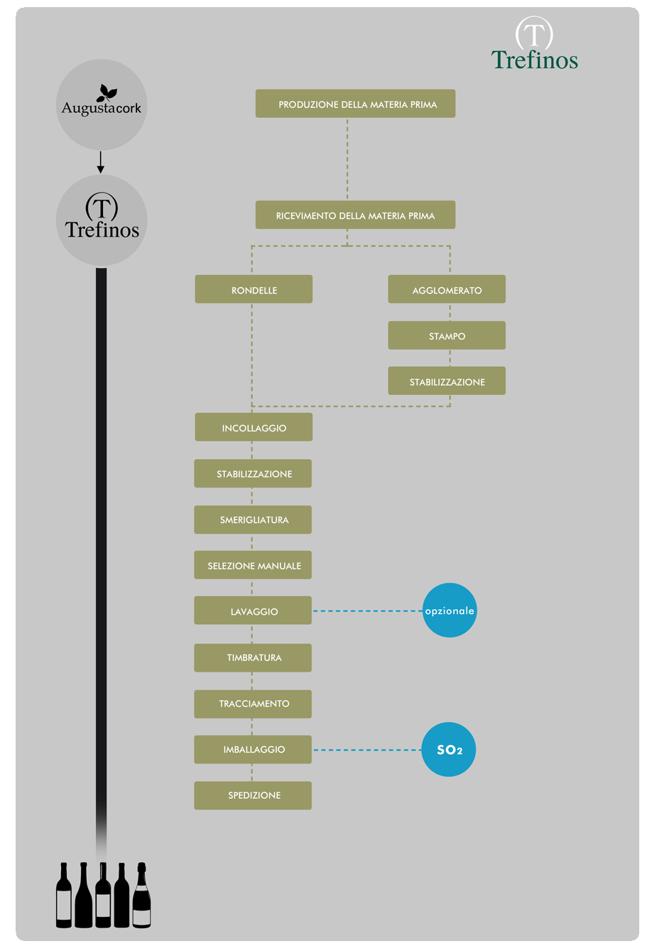 Trefinos suddivide questo processo tra due centri di produzione: Augusta Cork, in Extremadura, con una superfice di boschi di sughereti della qualità più eccellente a livello mondiale, e Trefinos, in Catalogna, in una zona dalla lunga tradizione e situata in una posizione strategica per la distribuzione in tutto il mondo.